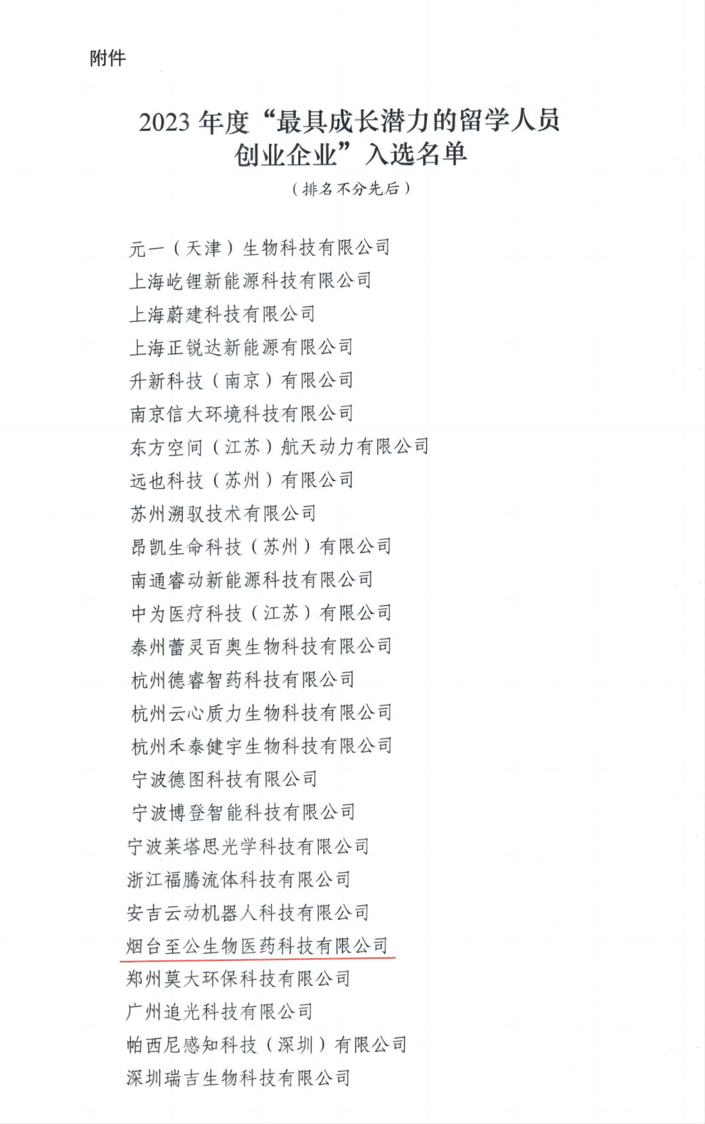 全省唯一!煙臺至公生物醫藥科技有限公司入選全國2023年度“最具成長潛力的留學人員創業企業”